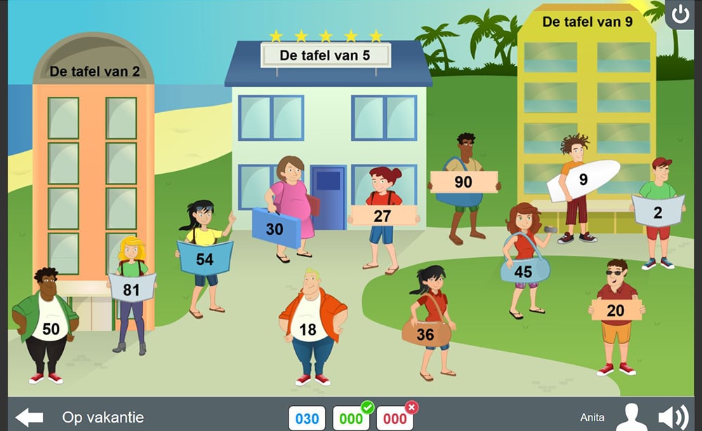 On Vacation is a drag-and-drop game based on multiplication tables, where the player has to drop the people on their relevant hotel. Each hotel has a times table it represents, and a few people can be placed into multiple hotels.