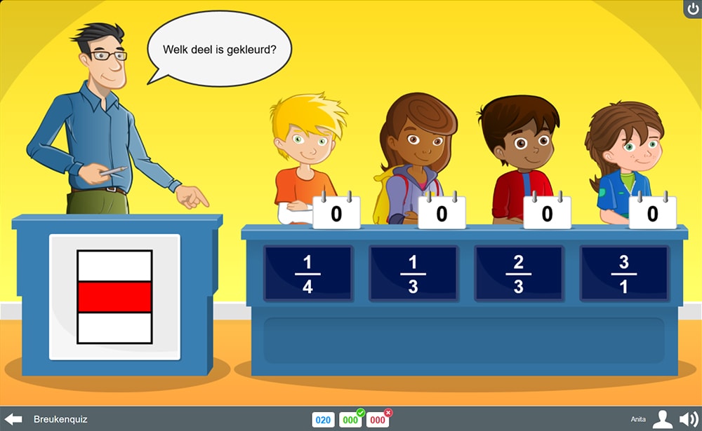 Fraction quiz is a game where you have to choose the correct answer for the fraction shown. When the correct one is selected, the character with the correct answer will get a point added to their score. If an incorrect one is selected, that character loses a point.